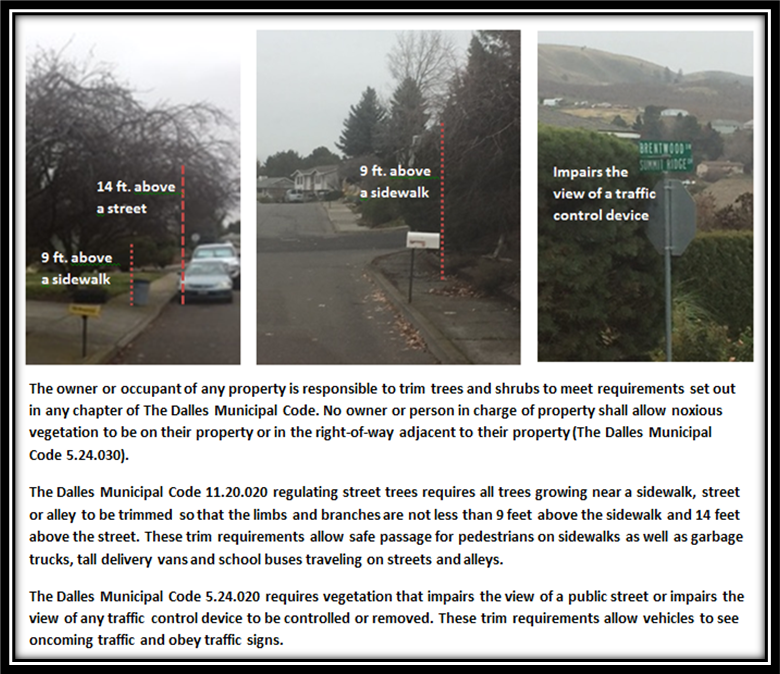 For more information about trimming trees and shrubs for traffic safety visit thedalles.org/trimtrees or contact the Public Works Department at (541) 296-5401.