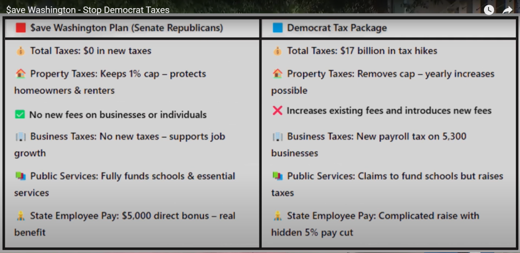 Washington, let’s talk taxes! Senate Democrats are pushing a massive tax hike that affects everyone—homeowners, renters, businesses, and consumers. But there’s a better way! Senate Republicans’ $ave Washington budget funds schools and services without raising taxes. Tell your legislators: No new taxes! SaveWA.org