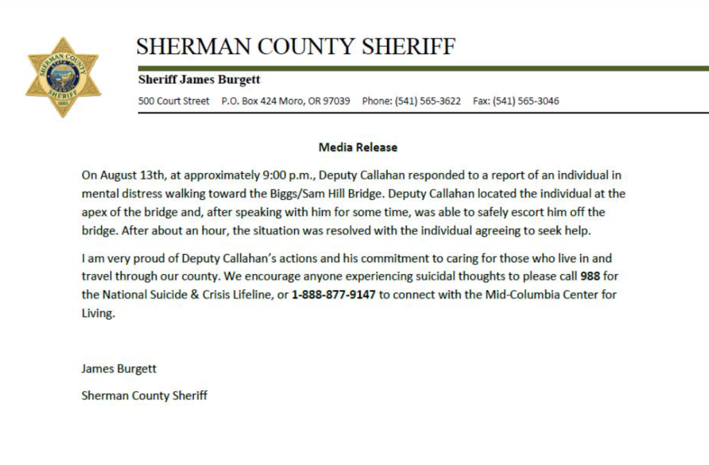 Sherman County Sheriff’s Deputy talks person off the Biggs Bridge August 20, 2025 GNCadm1n Local News Comments Off on Sherman County Sheriff’s Deputy talks person off the Biggs Bridge