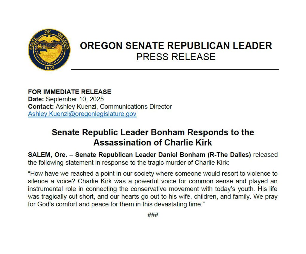 Senate Republican Leader Bonham Responds to the Assassination of Charlie Kirk September 10, 2025 GNCadm1n Oregon Comments Off on Senate Republican Leader Bonham Responds to the Assassination of Charlie Kirk