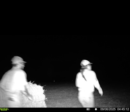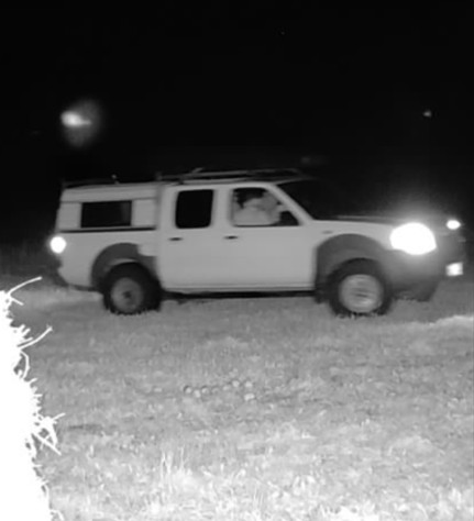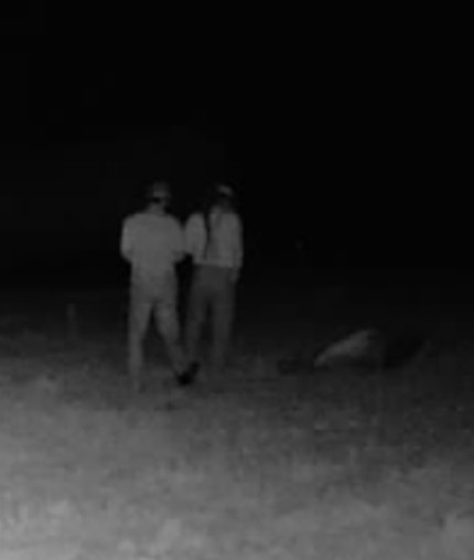 On Sept. 6, 2025, at 4:42 a.m., before legal hunting hours, a photo of a cow elk was taken by a trail camera on private property. At 4:45 a.m., two unknown individuals were captured on camera standing over the carcass of the dead elk. The individuals entered the private property in a vehicle, gutted the elk, and left. The suspect vehicle is believed to be a light-colored 2001–2004 Nissan Frontier with an older canopy and a roof rack.