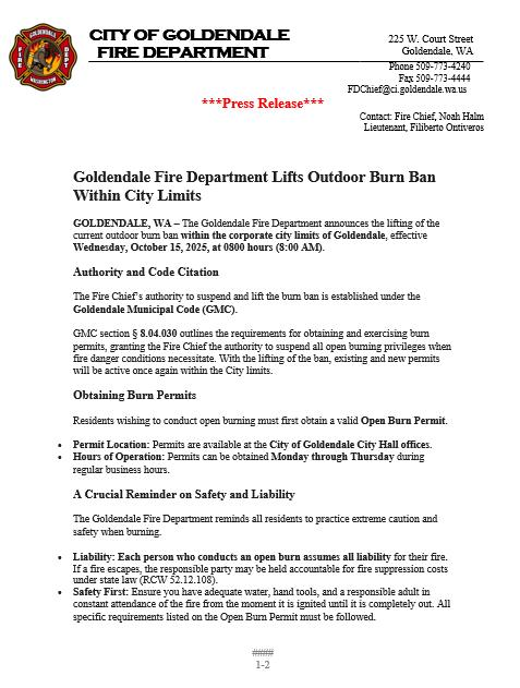 Goldendale Fire Department Lifts Outdoor Burn Ban October 14, 2025 GNCadm1n Local News Comments Off on Goldendale Fire Department Lifts Outdoor Burn Ban