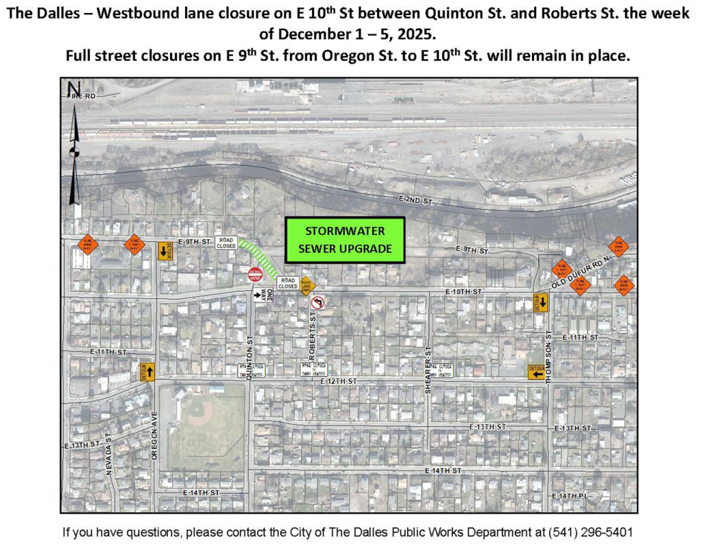 The Dalles, Oregon – The week of December 1 – 5, 2025 the City of The Dalles Public Works will work on E 10th St. between Quinton St. and Roberts St. to replace and upgrade a stormwater sewer main. This project is part of the ongoing work on E 9th St. and Quinton St.