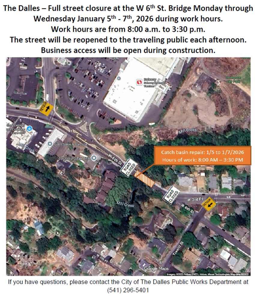 The Dalles, Oregon – On Monday January 5, 2026 the City of The Dalles Public Works will begin repairs to a catch basin on the 6th Street Bridge. The catch basin is creating a road hazard and must be repaired.