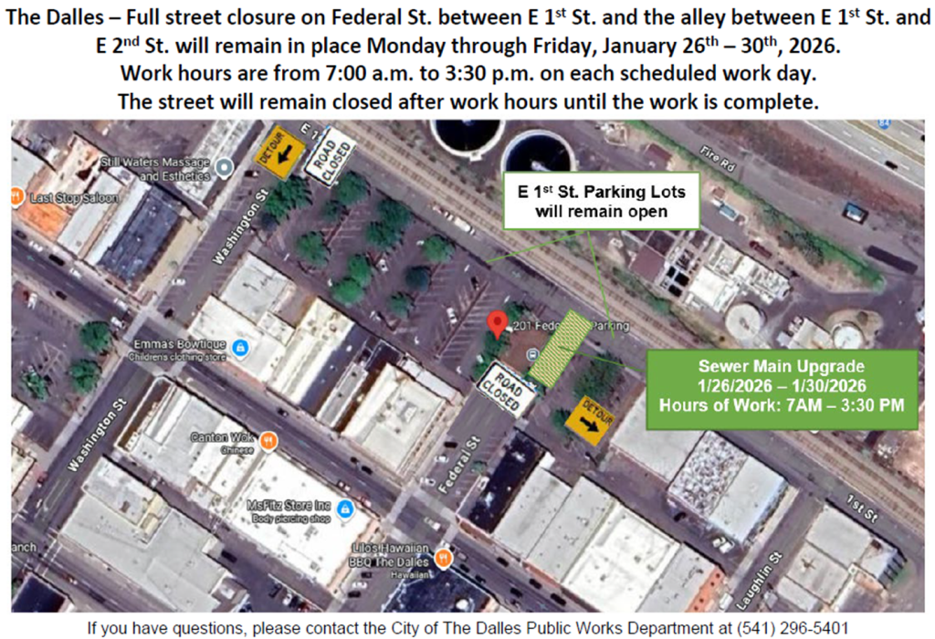 The Dalles, Oregon – On Monday January 26, 2026, the City of The Dalles Public Works will begin work on Federal St. between E 1st St. and E 2nd St. to replace and upgrade a sewer main in the area.